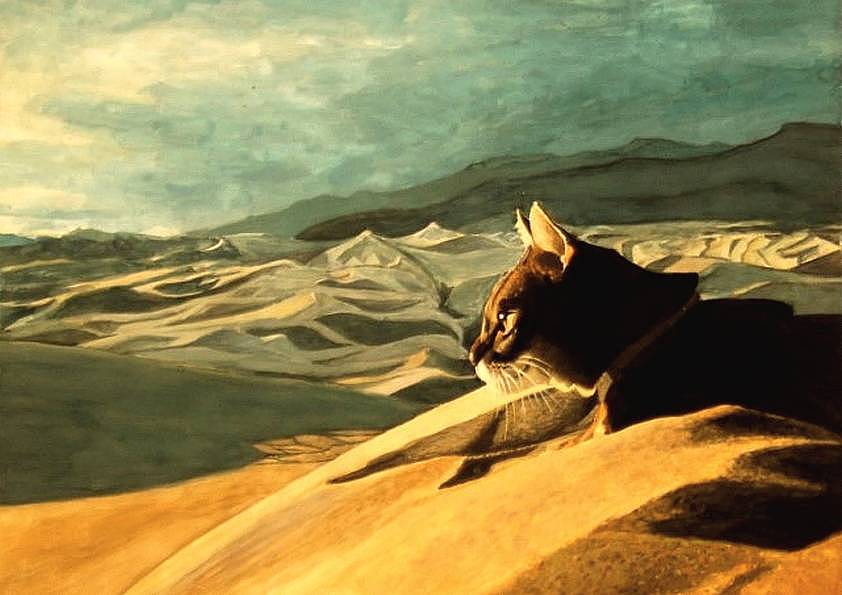 CHAT DANS LES DUNES . gouache CHATS (33 peintures) | 0 | Peinture vendue ANONYME Peinture réalisée en Mars 2007 CHAT DANS LES DUNES (peinture) Technique : peinture à la gouacheSupport : papier canson 29,70 x 42cm