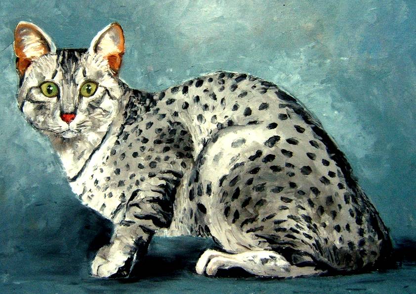 MAU EGYPTIEN . huile couteau CHATS (33 peintures) | 0 | Peinture vendue à Mme FRISON (Annot, France) Peinture vendue en Octobre 2016 MAU EGYPTIEN (peinture) Technique : peinture à l’huile au couteauSupport : carton entoilé coton 30 x 40cmRace : mau égyptien