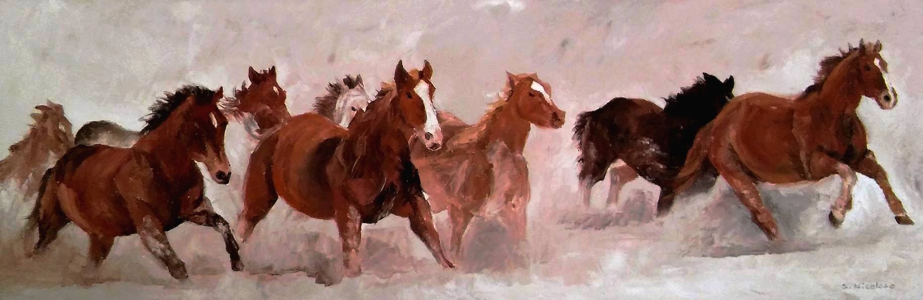 AU GALOP . huile couteau CHEVAUX (23 peintures) | 0 | Peinture vendue à M. BORIE (Salzuit, France) Peinture vendue en Septembre 2017 AU GALOP (peinture) Technique : peinture à l’huile au couteauSupport : toile coton 30 x 90cm