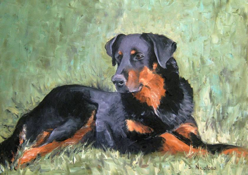 BEAUCERON . huile couteau CHIENS (137 peintures) | 0 | Peinture vendue à Mme COLLARD (Cheniers, France) Peinture vendue en Septembre 2016 BEAUCERON (peinture)BEAUCERON (original) Technique : peinture à l’huile au couteauSupport : carton entoilé coton 30 x 40cmRace : beauceron