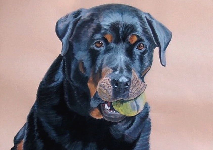 » Pour la Gouache : fond neutre , format 40X50 environ, lui laisser la balle dans la « gueule » ne pas reproduire les « larmes » des yeux… » – « bonsoir, j’ai bien recu le rott en gouache, tres joli travail. cordialment «