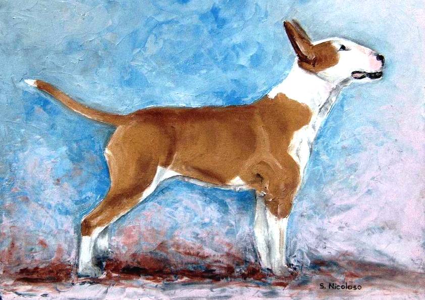 BULL TERRIER . huile couteau CHIENS (137 peintures) | 0 | Peinture vendue ANONYME Peinture réalisée en Août 2007 BULL TERRIER (peinture)BULL TERRIER (peinture) Technique : peinture à l’huile au couteauSupport : carton entoilé coton 30 x 40cmRace : bull terrier