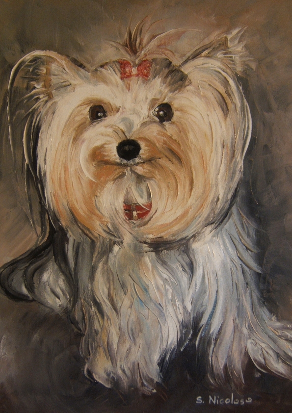 » Je vous envoie la photo de ma chienne FANZY, mais j’aimerai qu’elle est un noeud rouge, comme sur la petite photo… » – » le portrait de ma chienne est fantastique… formidable… «