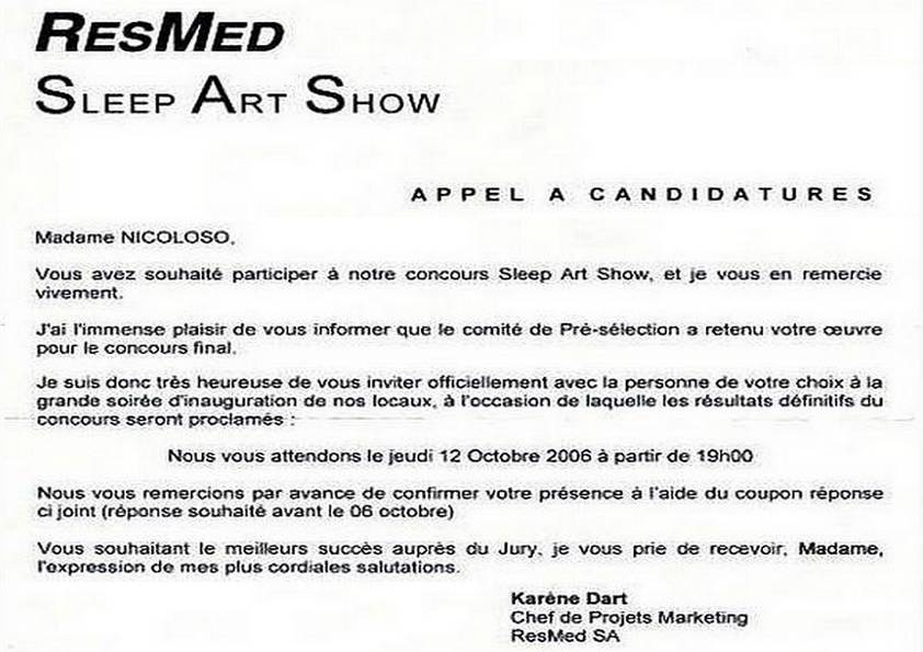 » A l’occasion de notre future installation dans de nouveaux locaux à Saint-Priest, notre société (RESMED SA) a décidé de lancer l’opération « Sleep Art Show« , concours artistique à destination des jeunes artistes lyonnais. C’est dans ce contexte que nous proposons de participer à ce concours doté de plusieurs prix, dont le 1er s’élève à 4.000 Euros. Vous voudrez bien trouver ci-joint, un exemplaire du règlement officiel, ainsi que le dossier de candidature. «
