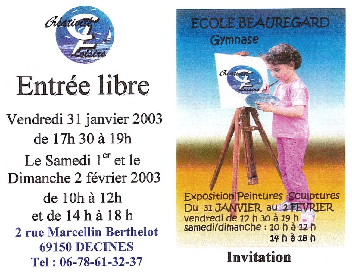 » Nous vous proposons d’exposer vos oeuvres en participation avec notre association CREATIVITE LOISIRS, pour I’exposition de peintures qui se déroulera dans le Gymnase de I’Ecole Beauregard à Décines du 31 Janvier au 2 Février. Nous aurons également le plaisir d’exposer avec les élèves de l’école. Une publicité importante sera faite autour de cette manifestation : presse, affiches… «