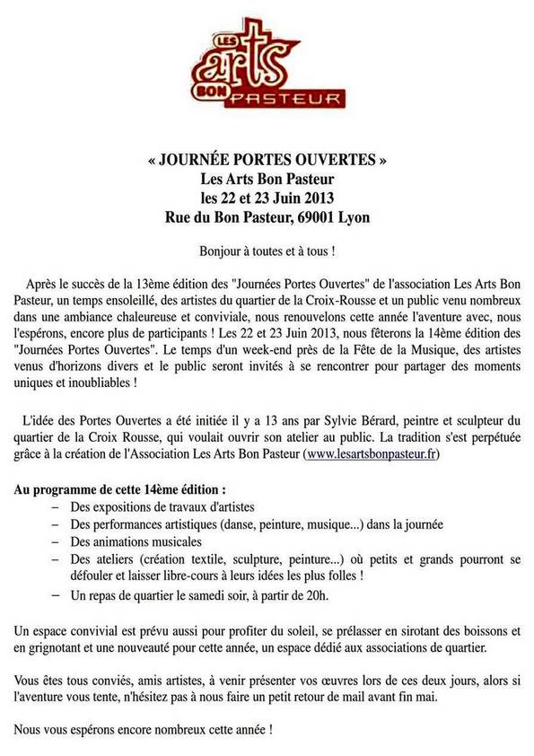 » La ville de LYON CROIX ROUSSE organise pour sa 13ème édition, les journées portes ouvertes dans les rues pour les artsites de 10h à 20h «