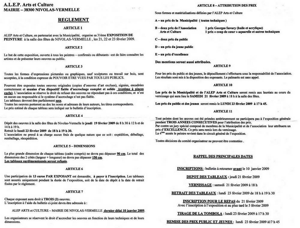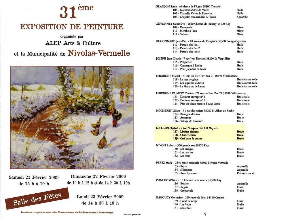 » Notre association organise à NIVOLAS VERMELLE sa 31ème exposition annuelle de peinture qui aura lieu les 21, 22 et 23 Février 2009 à la Salle des Fêtes «