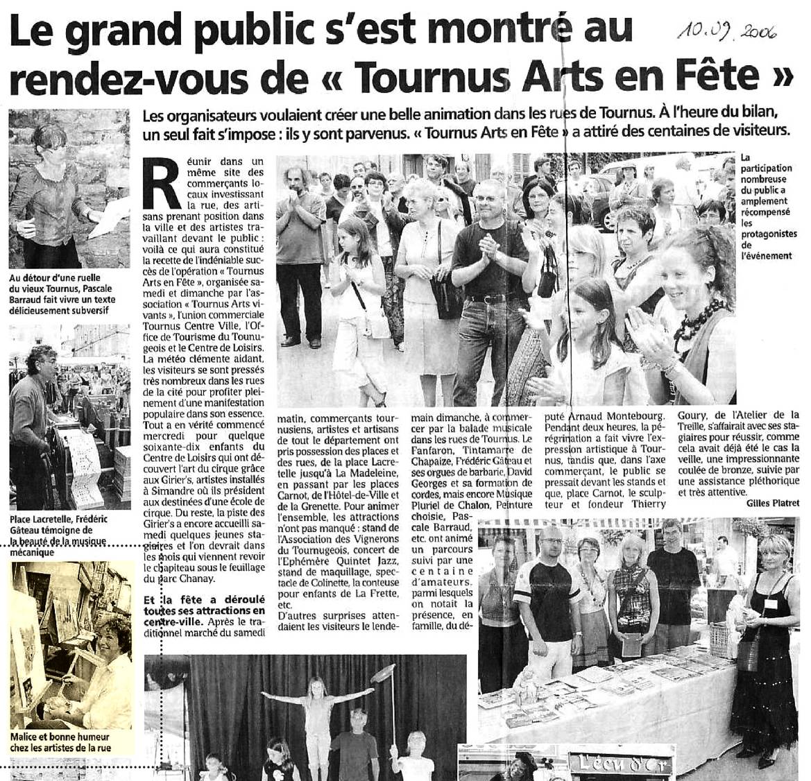 » L’association « Tournus Arts Vivants » organise un marché de l’art (Quai des arts)… Comme son nom l’indique, le marché a lieu sur les quais de Tournus (entre Mâcon et Chalon-sur-Saône sur la RN6)… Faire du centre ville de Tournus la RUE DES ARTS : peintures, sculptures, photos… avec animations divers, cirque, arts de la rue, musique sur les 2 jours «