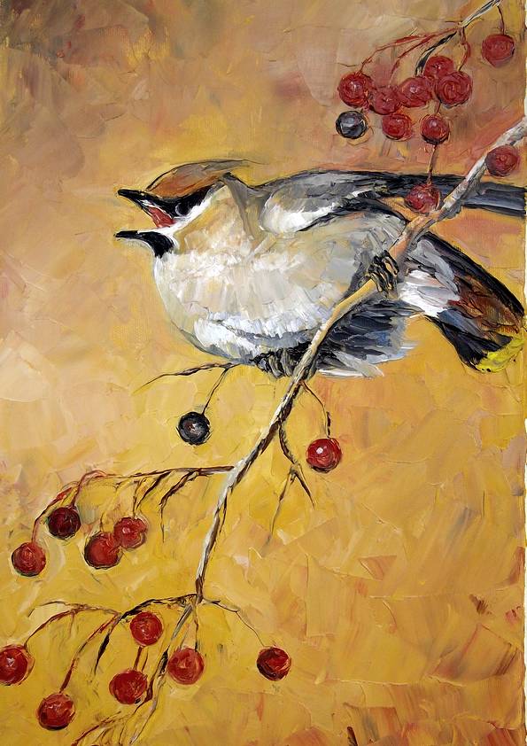 JASEUR BOREAL . huile couteau FAUNE (30 peintures) | 0 | Commande de M. et Mme SMOLAREK (Lyon, France) Peinture réalisée en Septembre 2014 JASEUR BOREAL (peinture)JASEUR BOREAL (original) Technique : peinture à l’huile au couteauSupport : toile coton 27 x 46cmEspèce : jaseur boréal