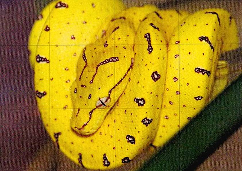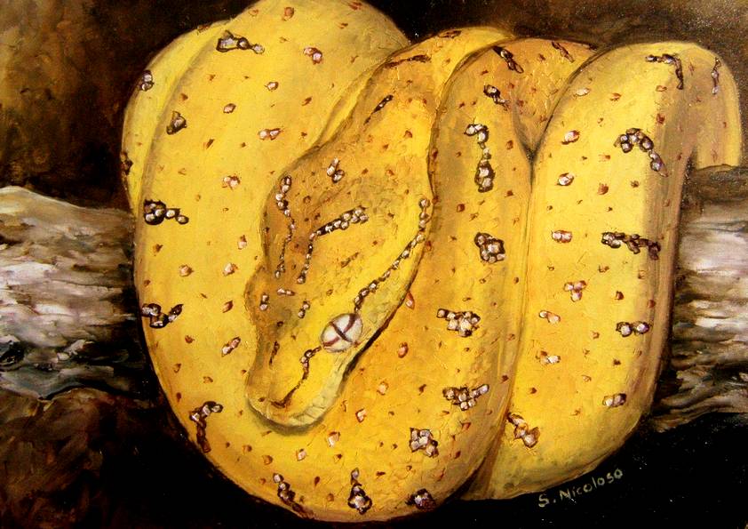 MORELIA VIRDIS . huile couteau FAUNE (30 peintures) | 0 | Peinture vendue à M. GIMENEZ (Meyzieu, France) Peinture vendue en Août 2015 MORELIA VIRIDIS (peinture)MORELIA VIRIDIS (original) Technique : peinture à l’huile au couteauSupport : carton entoilé coton 30 x 40cmEspèce : python vert / serpent