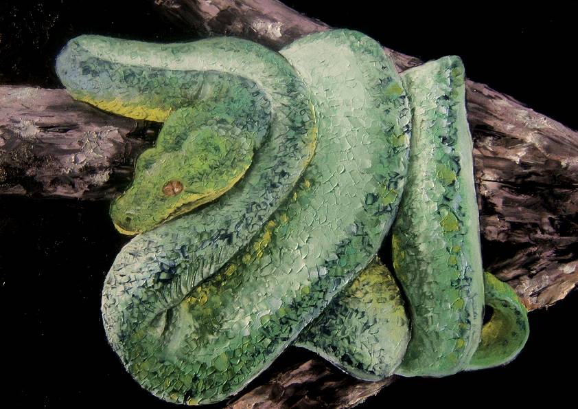 PYTHON ARBORICOLE VERT . huile couteau FAUNE (30 peintures) | 0 | Peinture vendue ANONYME Peinture réalisée en Juin 2015 PYTHON ARBORICOLE VERT (peinture)PYTHON ARBORICOLE VERT (original) Technique : peinture à l’huile au couteauSupport : carton entoilé coton 30 x 40cmEspèce : python vert / serpent